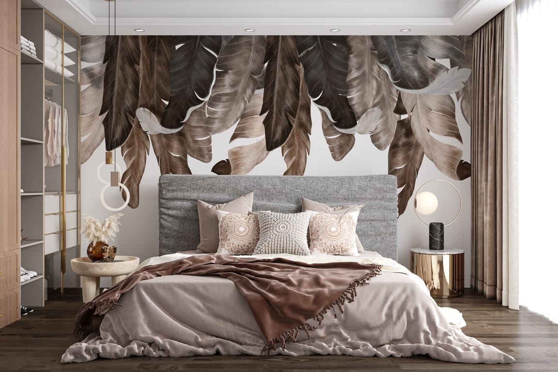 Listy mají různé odstíny hnědé barvy a jsou na bílém pozadí, takže jsou dokonale viditelné. Barevné schéma je velmi univerzální, takže je tato nástěnná malba vhodná pro jakoukoli místnost, ve které má být umístěna.