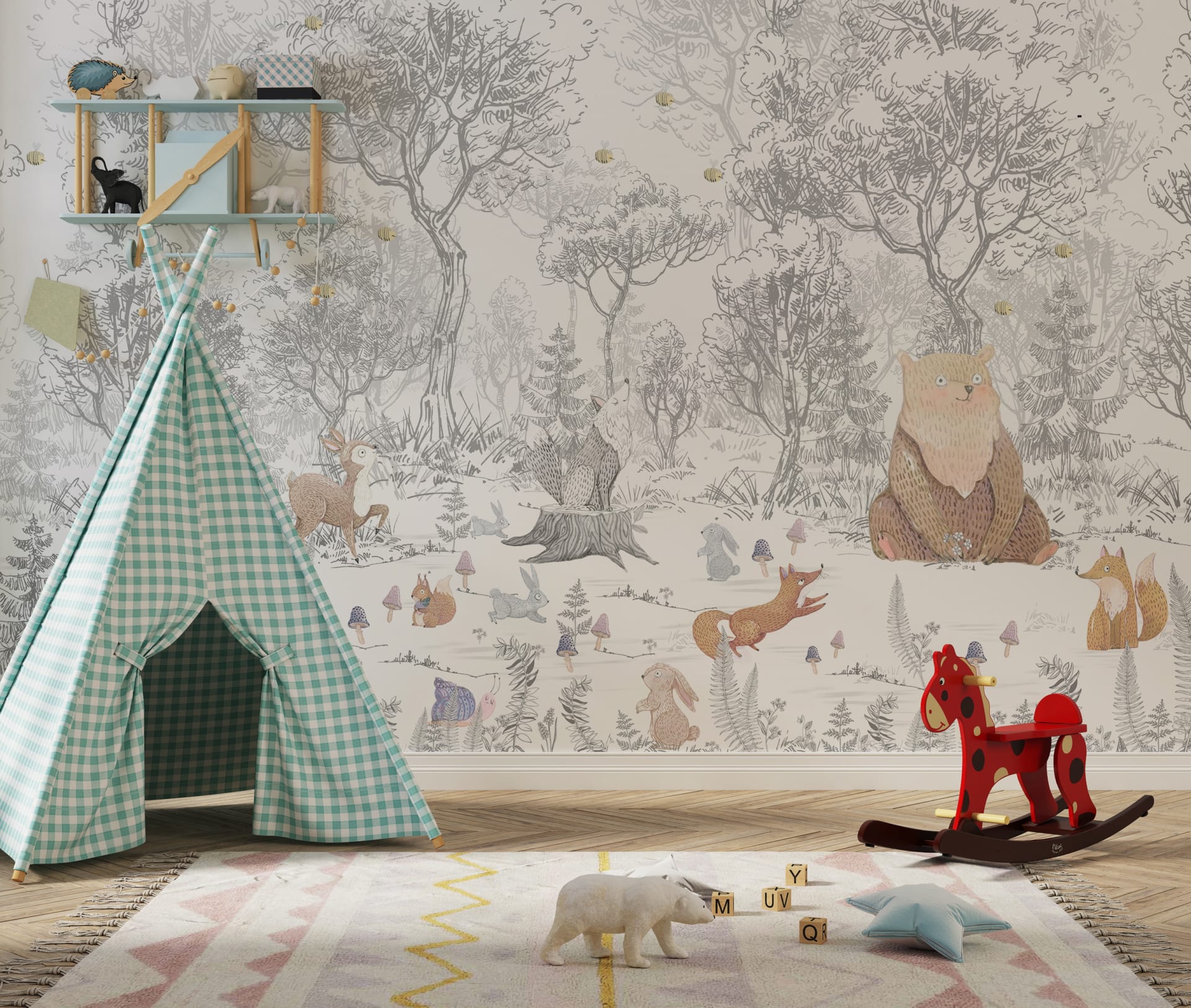 Atmosféra lesa v jemných tónech Barevná lesní zvířata pro dětský pokoj - hlavní obrázek produktu