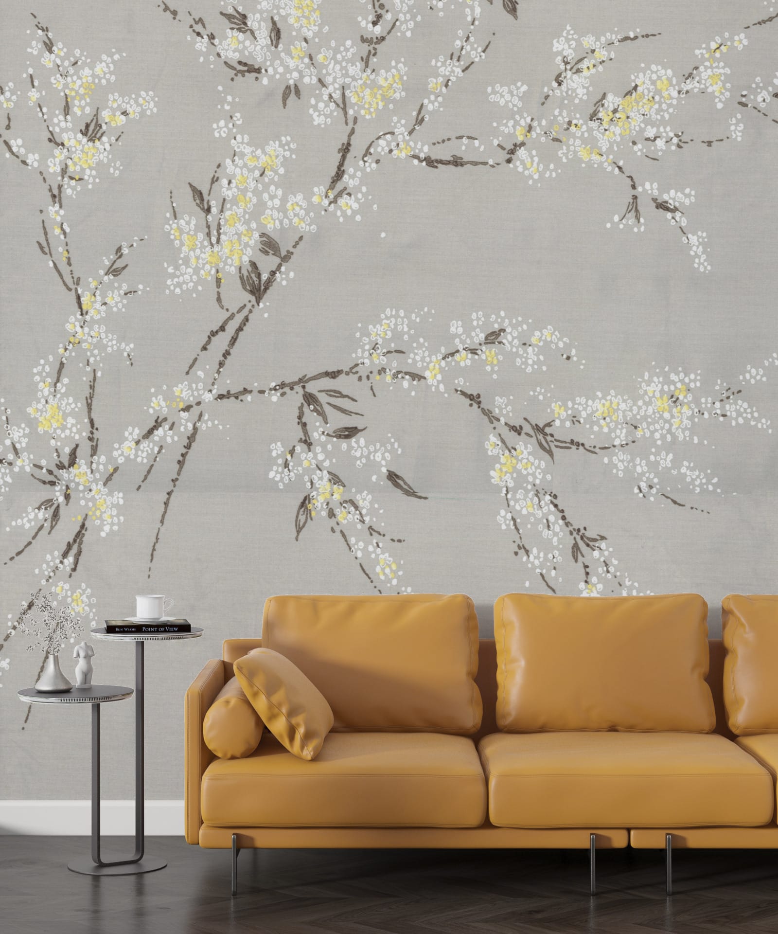 Nástěnná malba kvetoucího stromu na šedomodrém pozadí Bílé jarní květiny - obrázek číslo 2