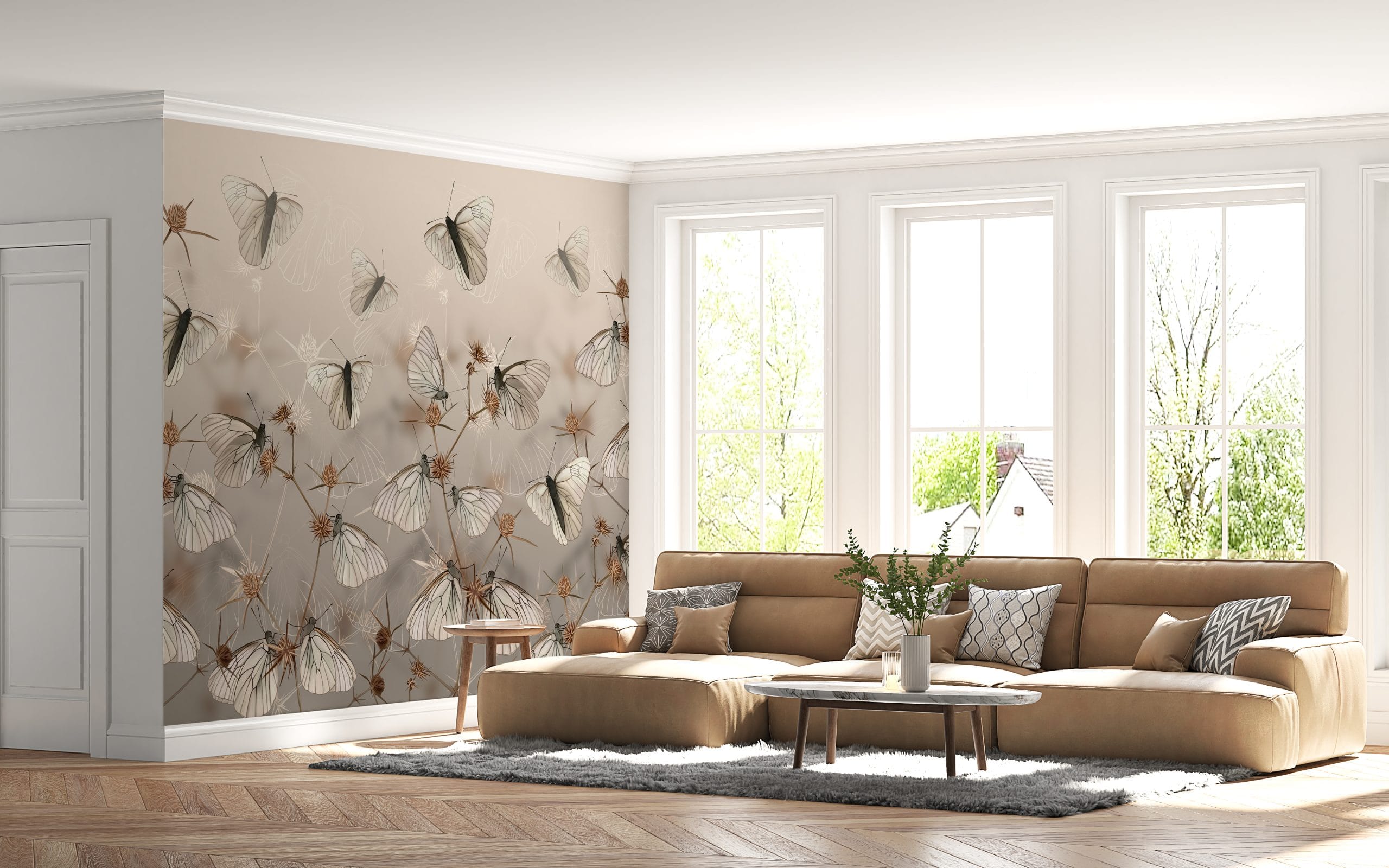 Fototapeta ve světlých odstínech s jemným motivem bílých motýlů - hlavní obrázek produktu