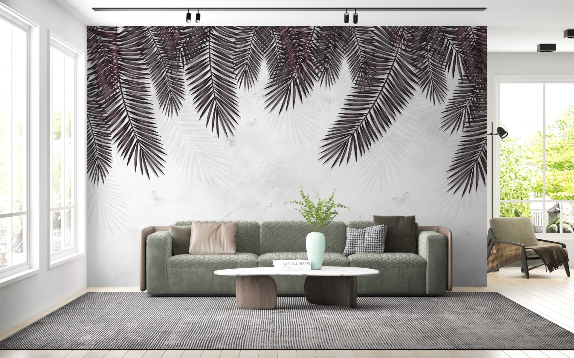 Nástěnná malba v černé a šedé barvě s květinovým motivem a motýly Black Palm Leaves - hlavní obrázek produktu