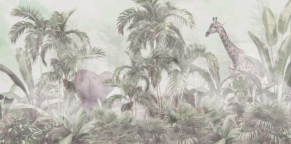 Nástěnná malba se slonem a žirafou ukrytá v tropické džungli Divoká zvířata v mlze - obrázek číslo 2