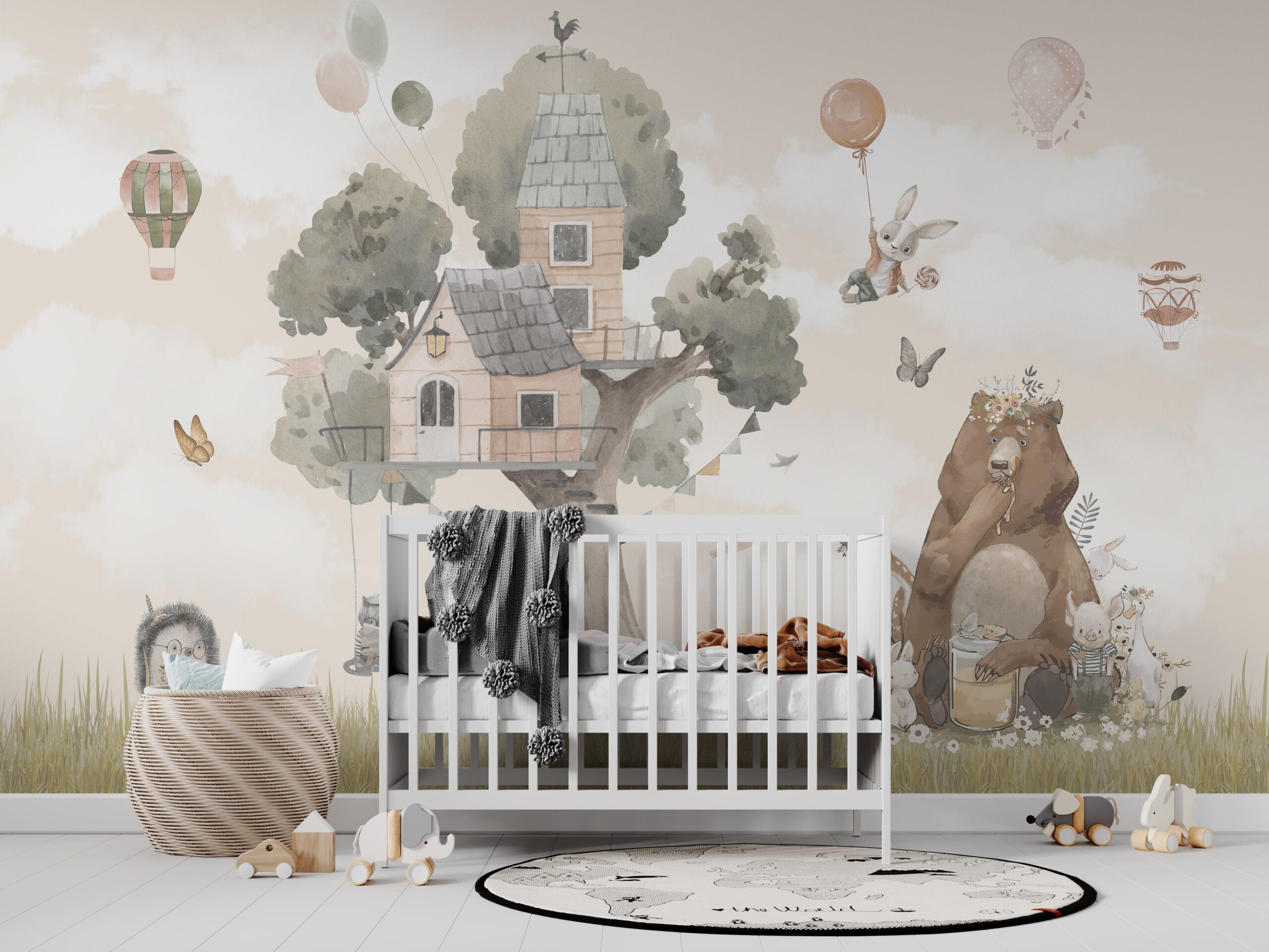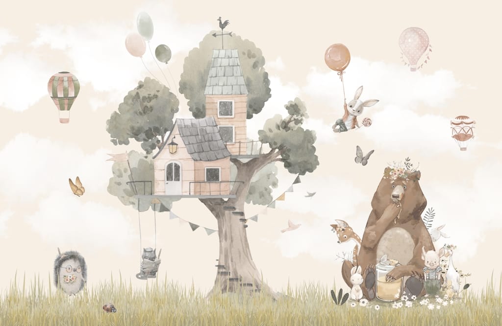 Nástěnná malba v podobě ilustrace pohádkového výjevu v barvách vhodných do dětského pokoje Tree House For Kids - hlavní obrázek produktu