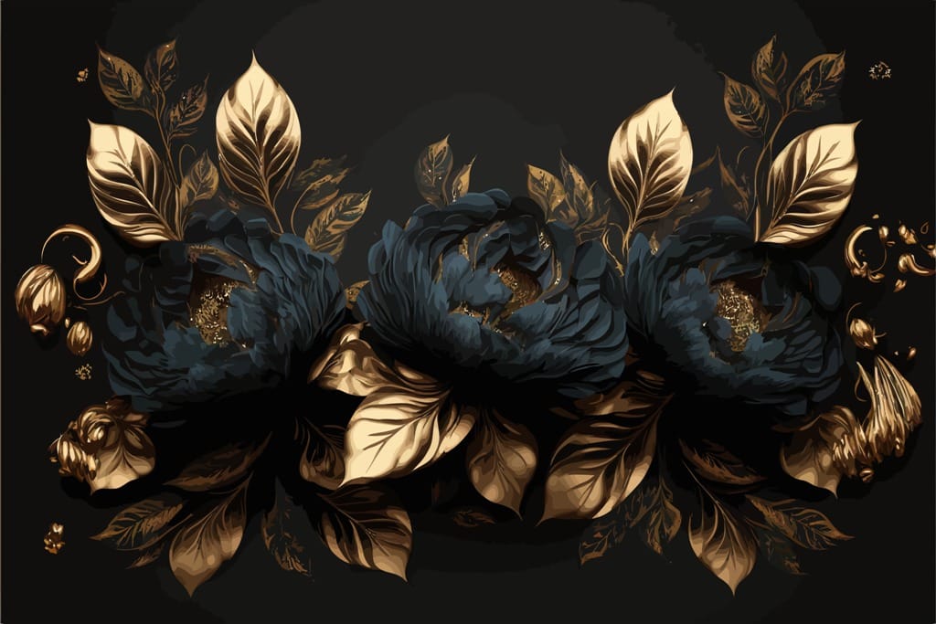 Nástěnná malba s velkými květy pivoněk v neobvyklých tmavých barvách, elegantní a zajímavá Granátové jablko a zlatý květ - hlavní obrázek produktu