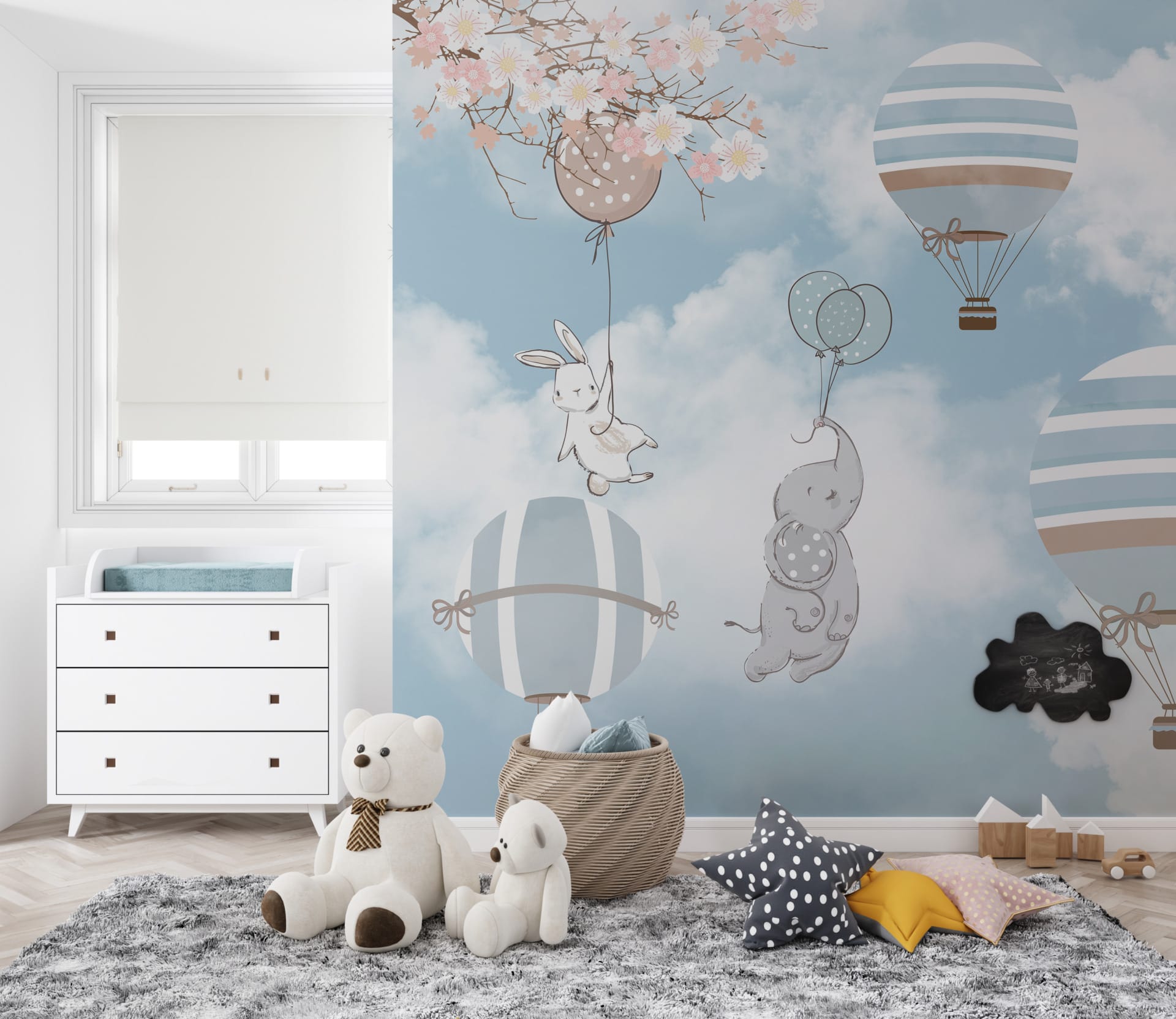 Tapeta se zvířaty a třešňovými květy v tlumených barvách Spring Balloon Flight pro dětský pokoj - hlavní obrázek produktu