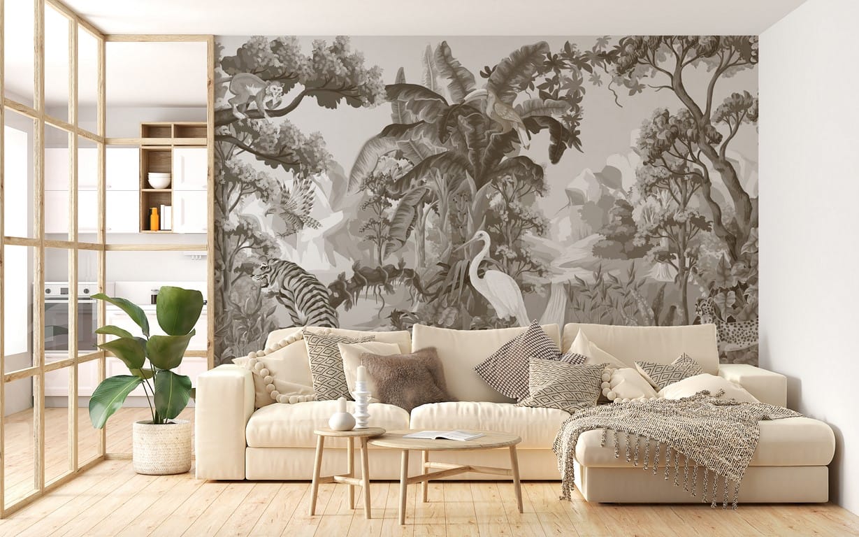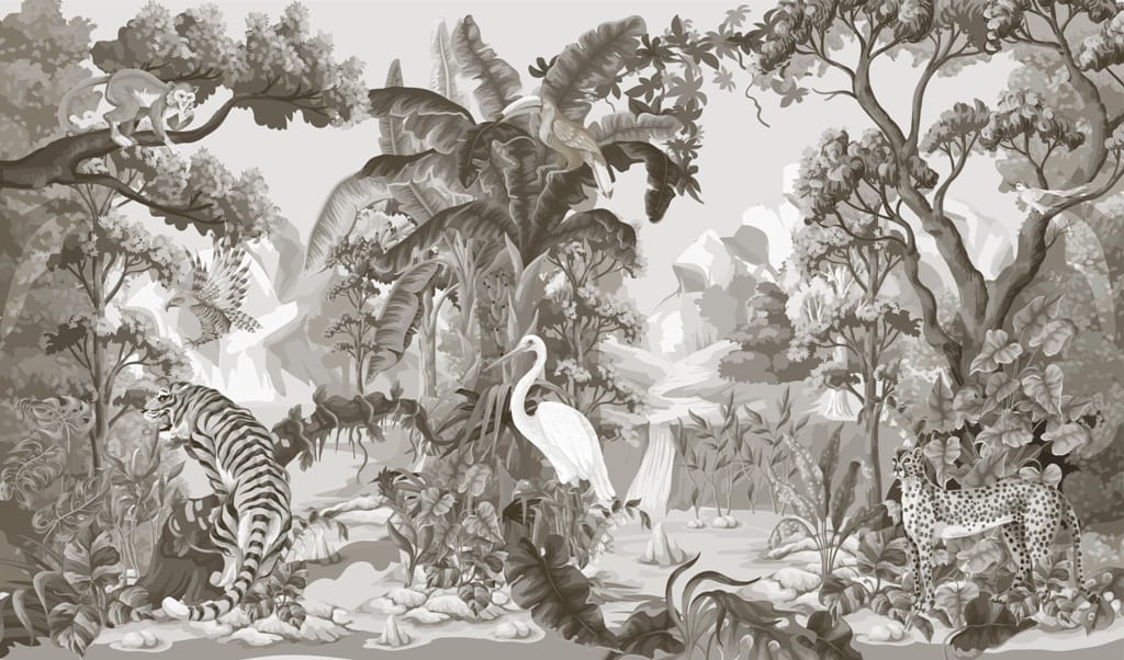 Hodí se do moderního pokoje a je vhodný i do boho interiéru. Zobrazuje exotická zvířata ukrytá v tropické džungli. Pokud chcete do svého domova vnést nádech exotiky, tato nástěnná malba se vám bude opravdu hodit.