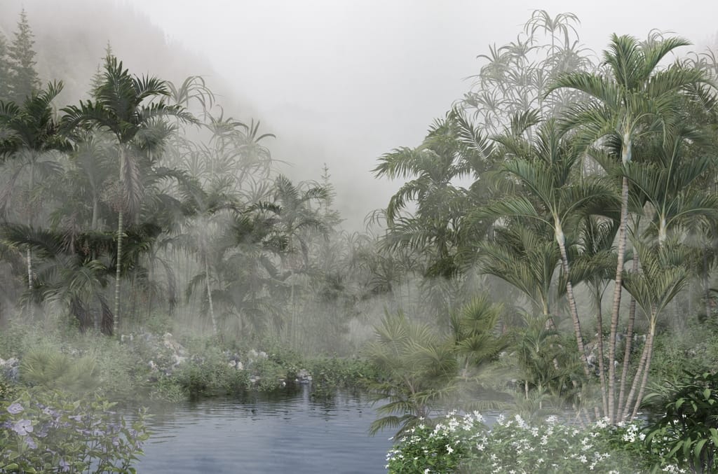Nástěnná malba týkající se přírody. Zobrazuje jezero ukryté uprostřed exotické vegetace. Nejen palmy jsou na něm k vidění. Jemné bílé květy rozjasňují celek a dodávají mu lehký nádech. Udržované v tlumených barvách. Není proto třeba se obávat, že by v interiéru dominoval. Lze ji použít k uspořádání stěny v obývacím pokoji. Je vhodný i do ložnice. Dobře se hodí i do chodby. S jeho pomocí lze zařídit i kuchyň. Ideální pro nejnáročnější.
