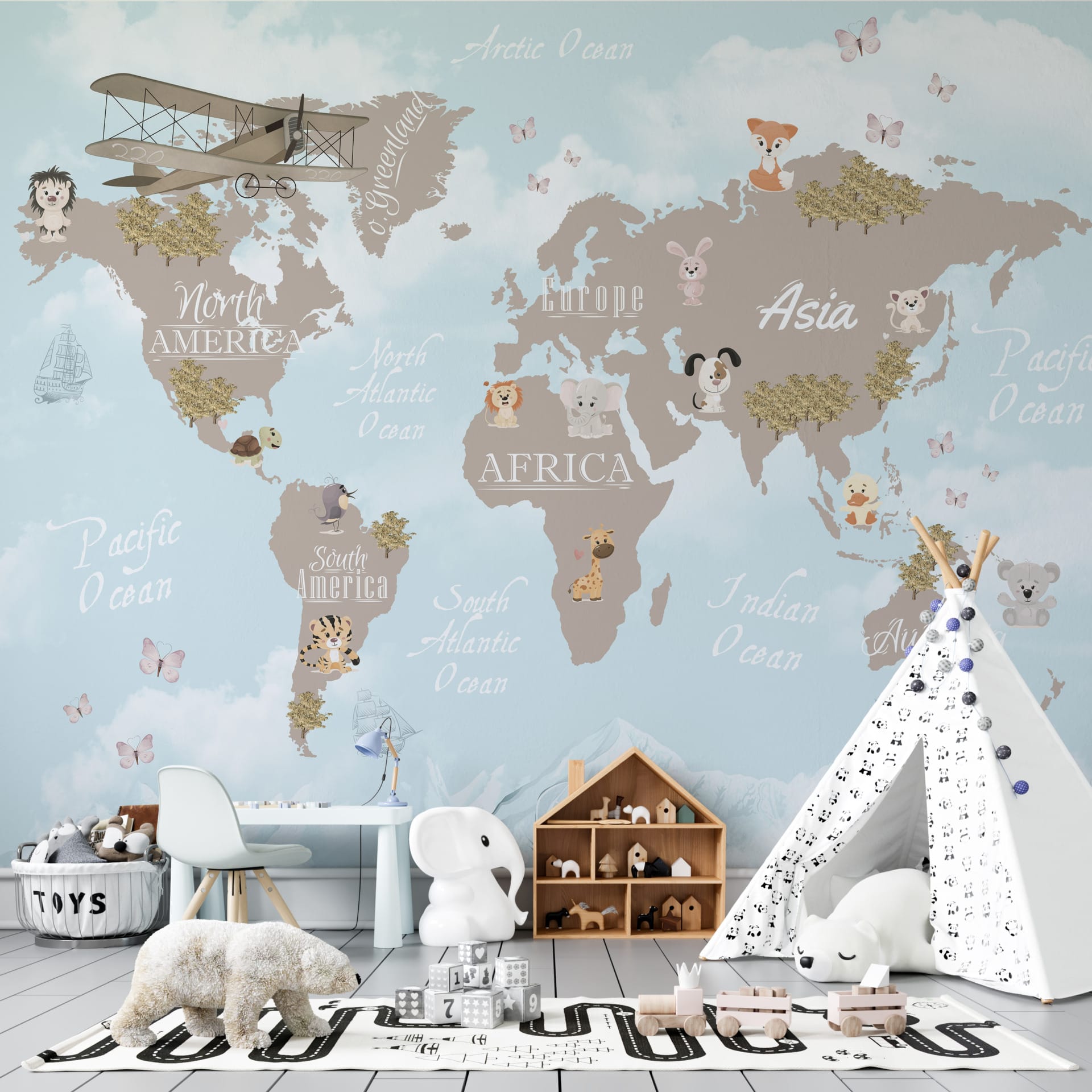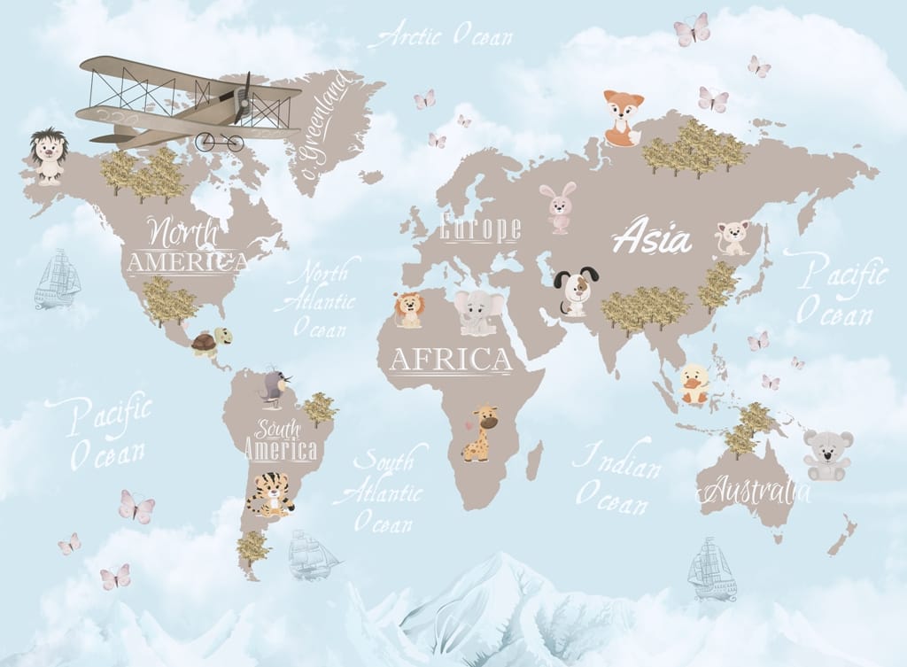 Dětská nástěnná malba se zvířaty na mapě světa a bývalým letadlem Kontinenty mezi mraky - hlavní obrázek produktu