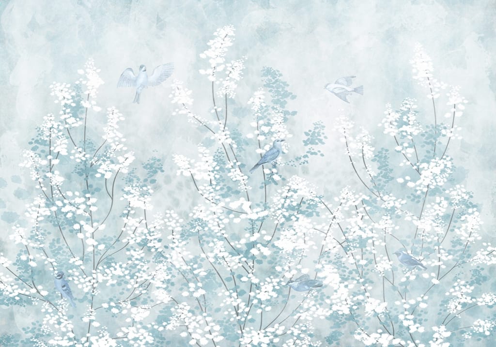 Nástěnná malba v odstínech bílé a modré s jemným květinovým motivem Blossoms On White - hlavní obrázek produktu
