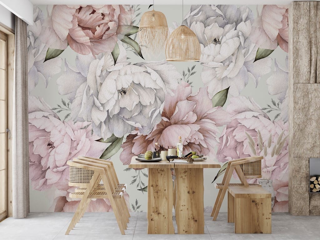 Jedinečná nástěnná malba navržená tak, aby působila romanticky. Zobrazuje mimořádně elegantní kytici světlých pivoněk, které byly umístěny na jemném dokonale hladkém pozadí. Celkový vzhled je mimořádně kultivovaný.