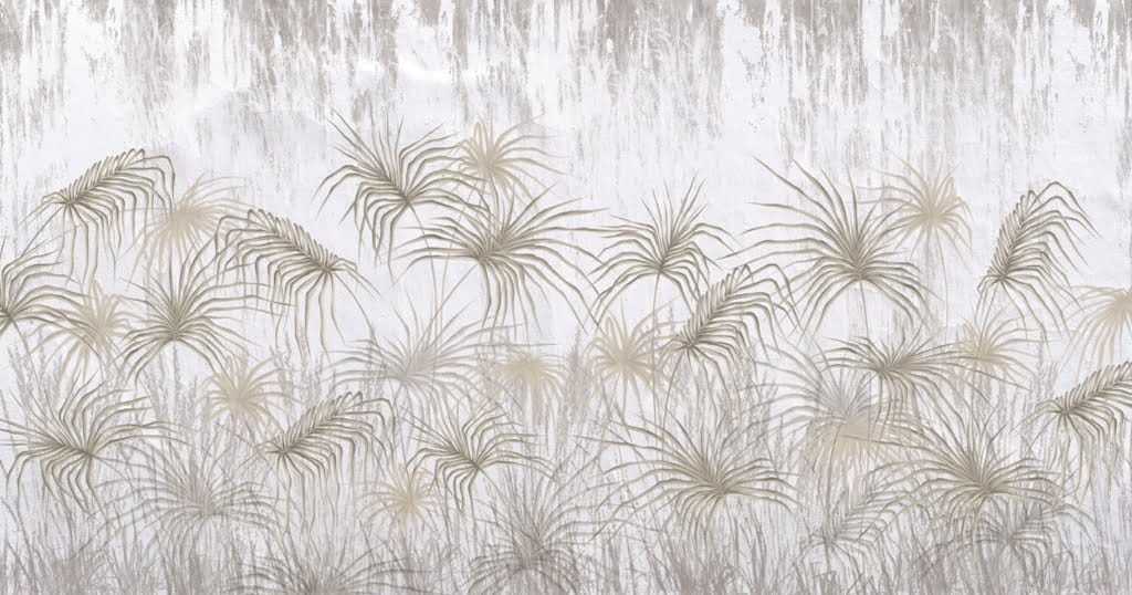 Mimořádně subtilní nástěnná malba zobrazující les tropických palmových listů. V popředí jsou palmové listy, které jsou nádherně exotické a zároveň lehké.
