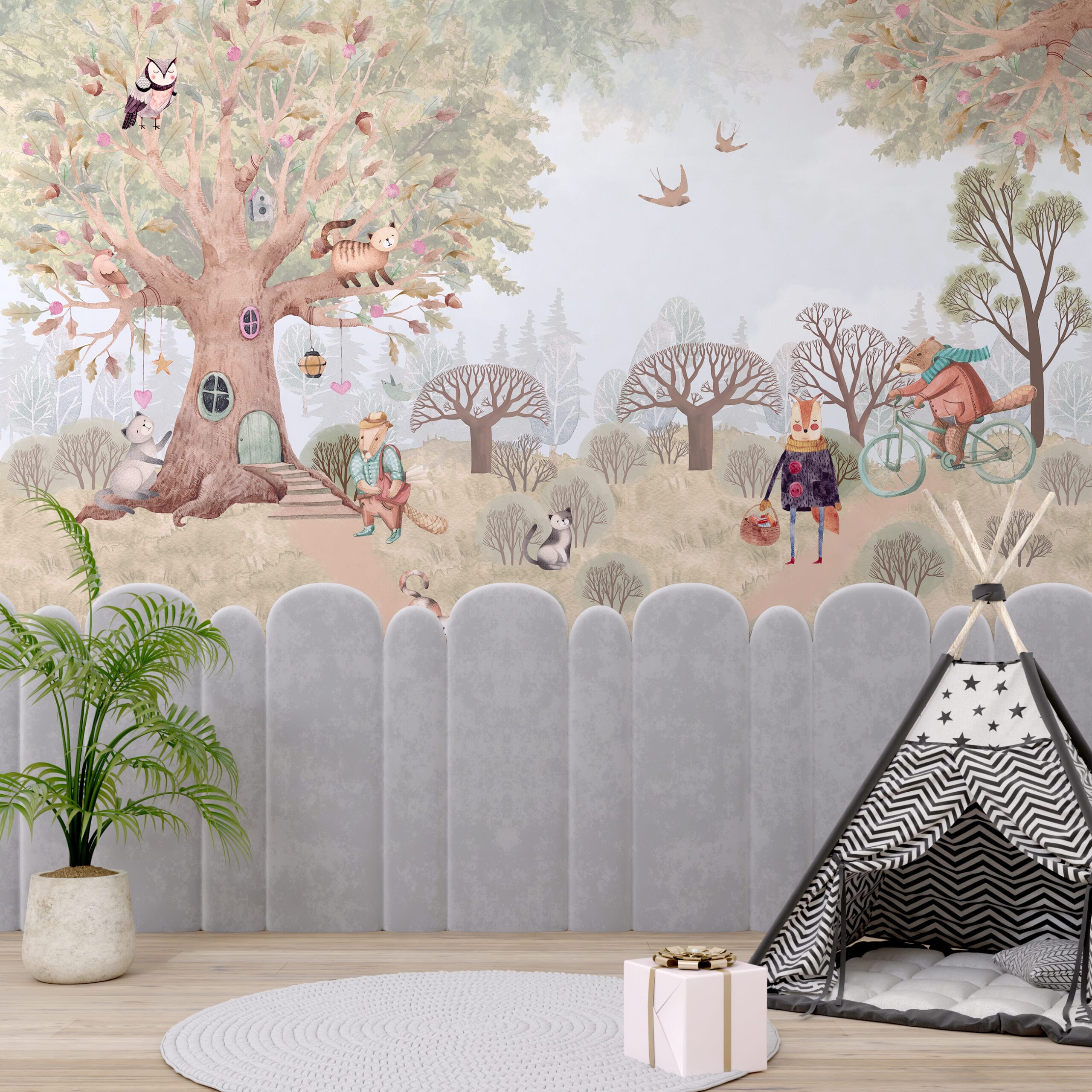 Fototapeta v teplých barvách s motivem pohádkových lesních zvířat do dětského pokoje Lesní pohádkový dům - hlavní obrázek produktu