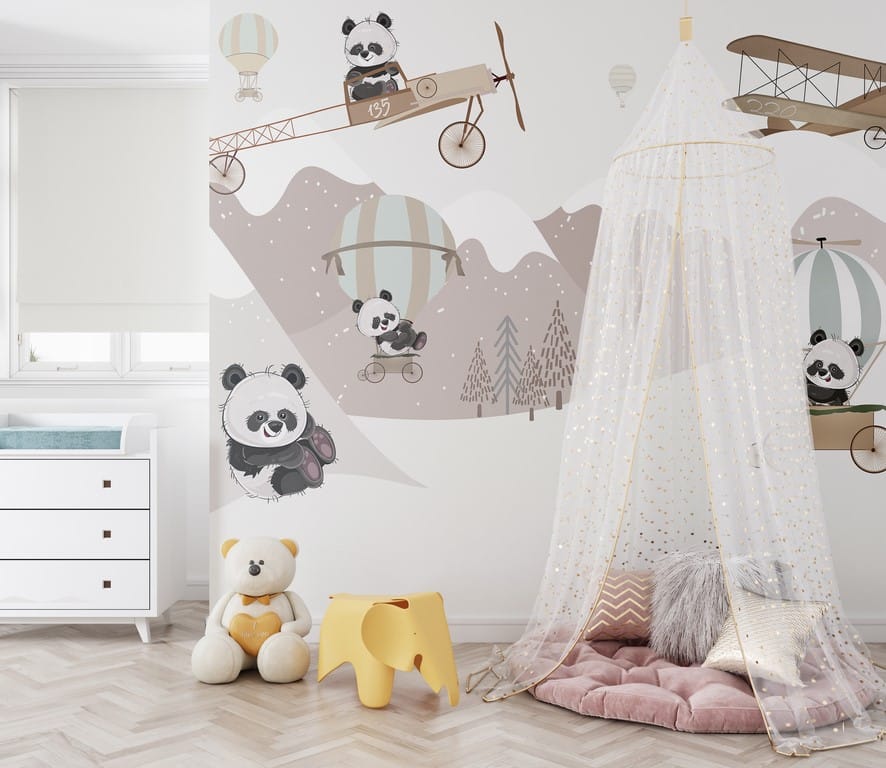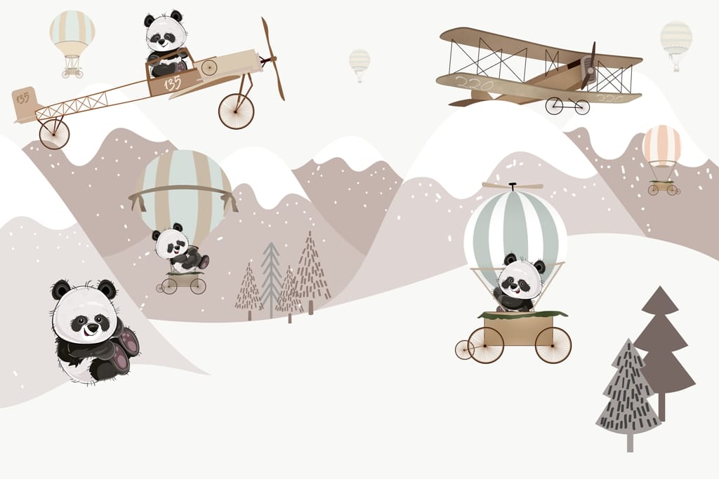 Tato nástěnná malba byla navržena s ohledem na děti a zobrazuje pandy v hravých situacích. Dítě najde tohoto roztomilého medvídka, který létá v letadle a v balonu. Pandy se usmívají, což má také pozitivní vliv na náladu batolete. Barvy jsou zvoleny tak, aby nebyly příliš intenzivní. Díky tomu je nástěnná malba vhodná i pro opravdu malé děti. Jejím umístěním na zeď vytvoříte skutečné dětské království. Je zcela bezpečný, při jeho výrobě nebyly použity žádné látky, které by mohly představovat riziko pro nejmenší.