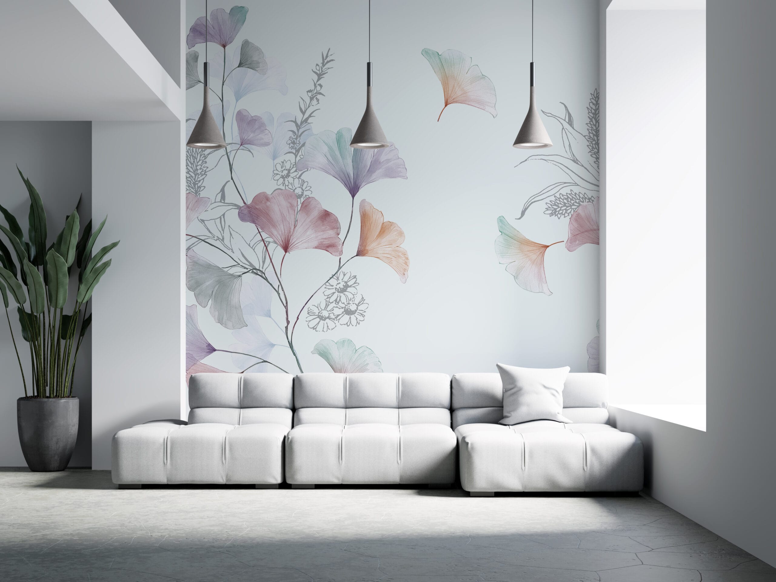 Nástěnná malba s jemným květinovým motivem ve světlých tónech na bílém pozadí - Foto 2
