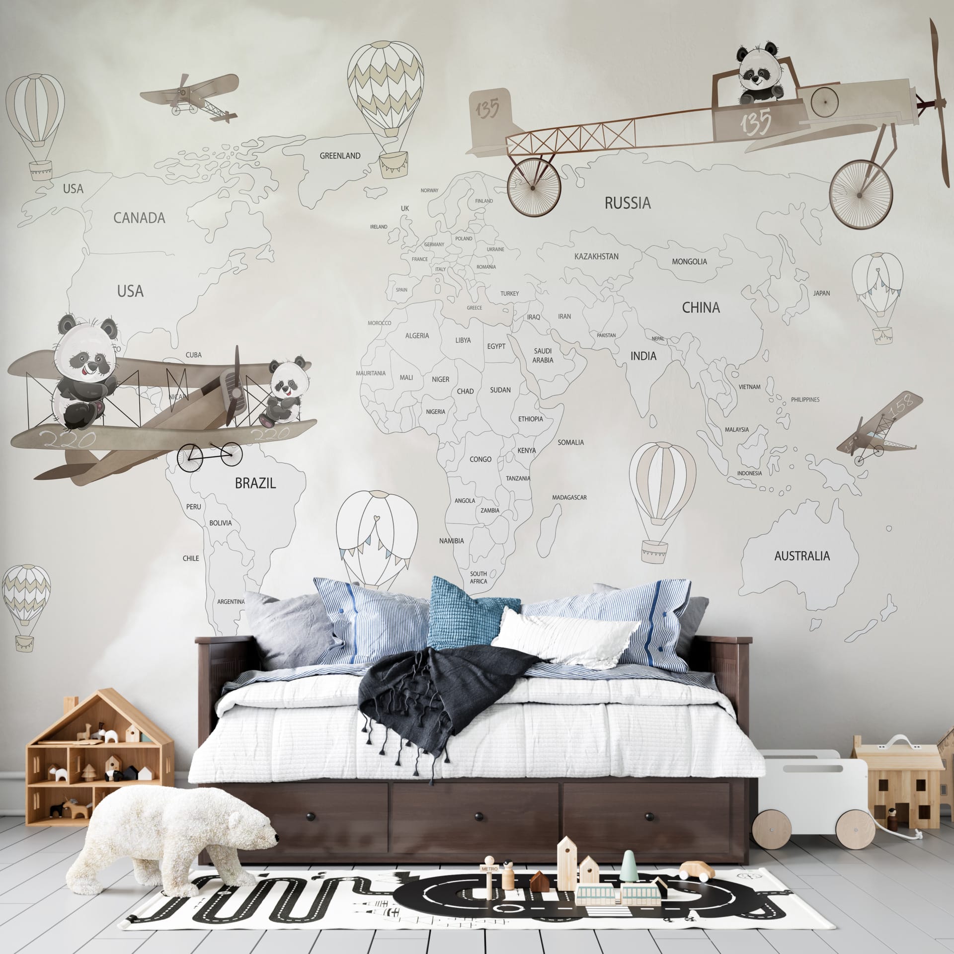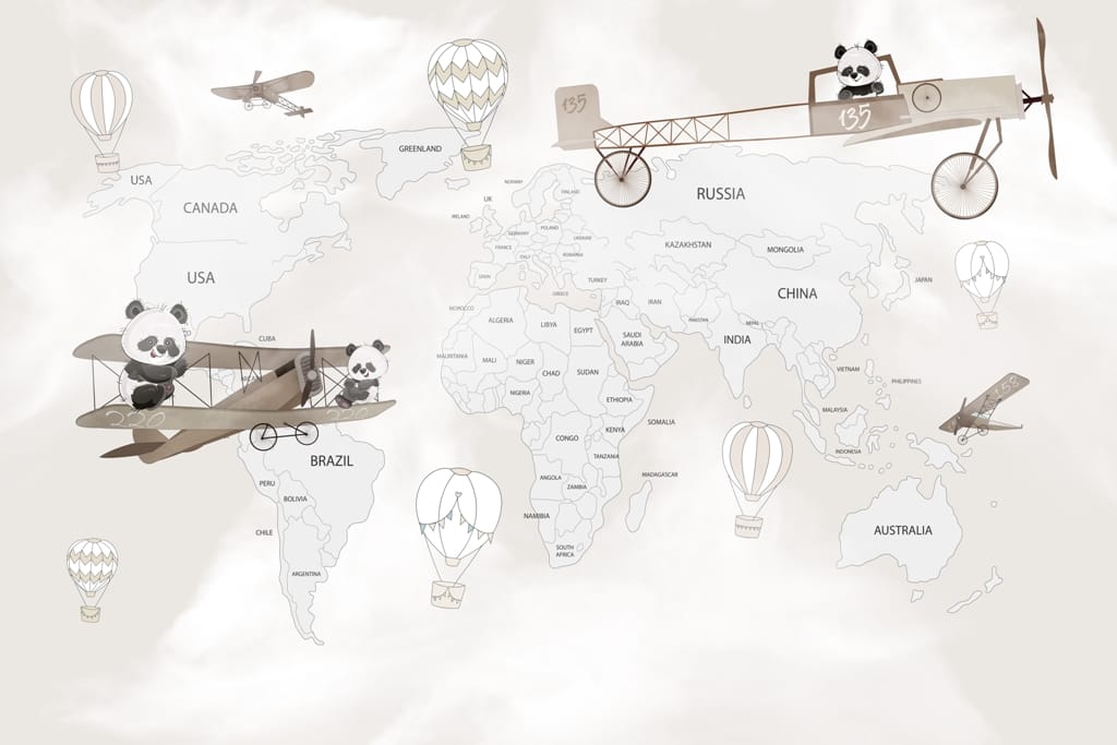 Nástěnná malba medvídků létajících ve starých letadlech nad mapou světa Pandy na mapě světa - hlavní obrázek produktu