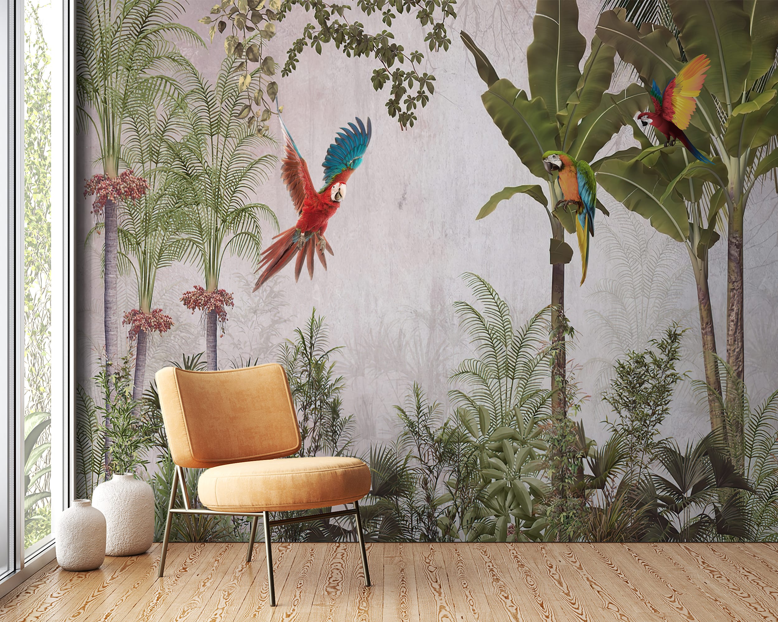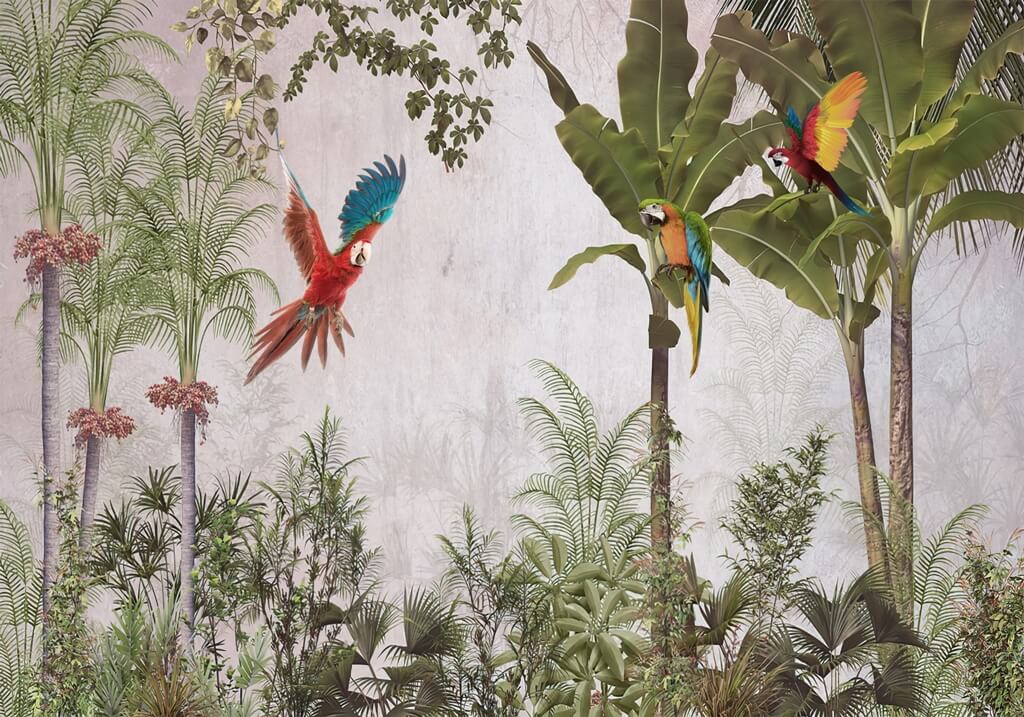 Nástěnná malba s exotickými palmami a barevnými ptáky Papoušek v letu - hlavní obrázek produktu