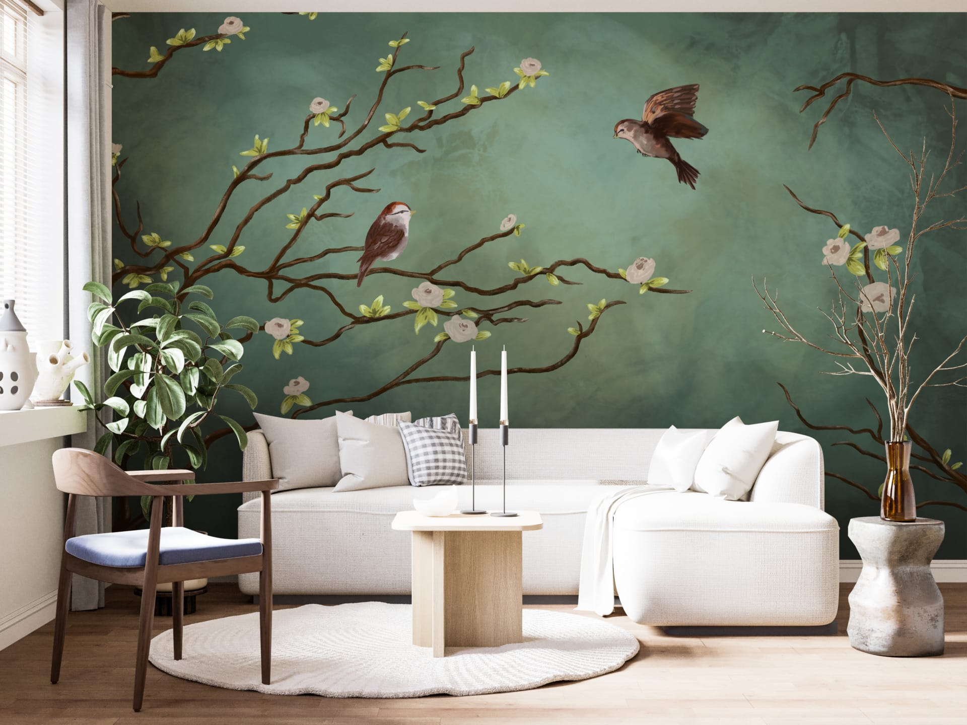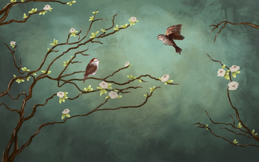 Příroda nástěnná malba na tmavě zeleném pozadí Pár ptáků na kvetoucím stromě pro obývací pokoj - hlavní produktobraz