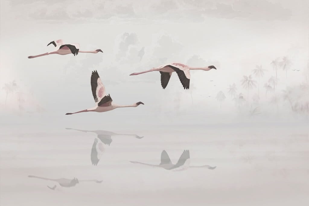 Fototapeta v asijském stylu ideální pro moderní obývací pokoj Flamingos in Flight - hlavní obrázek produktu