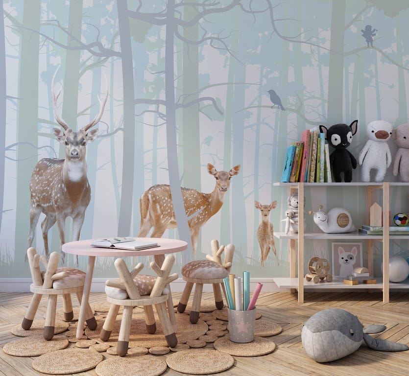 Šedá barva je zde kombinována s různými odstíny modré. V dolním rohu nástěnné malby jsou tři jeleni, což je jediný výraznější prvek. Jsou zřetelně poutavé a dodávají nástěnné malbě na originalitě.