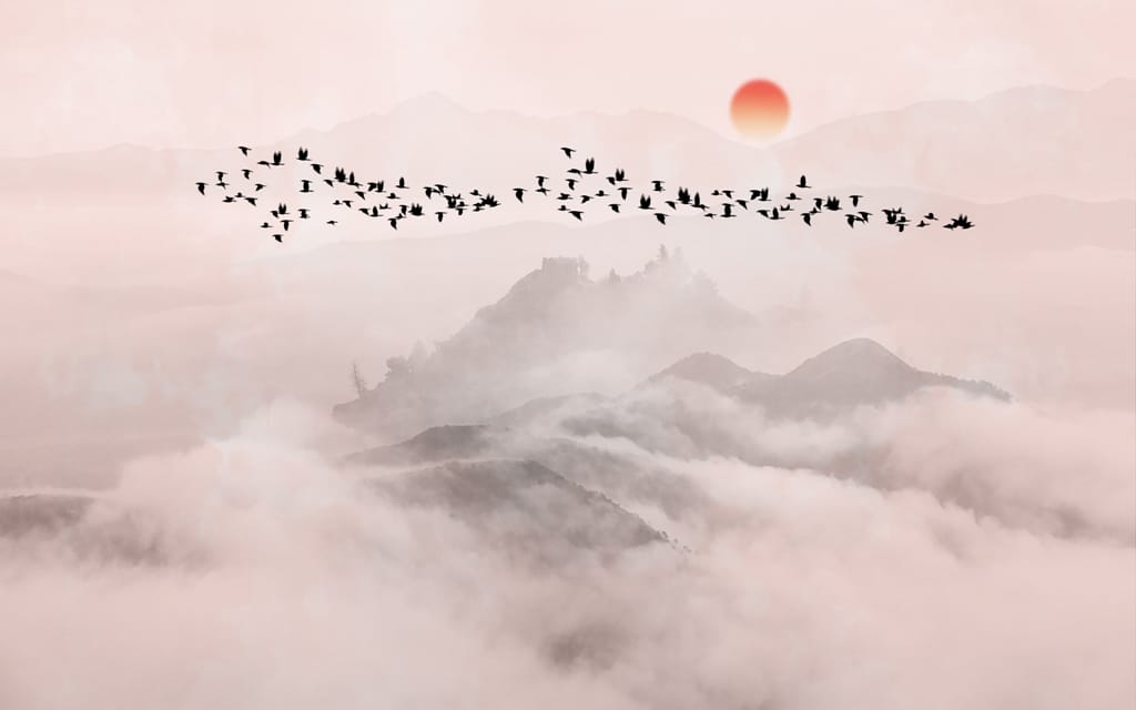 Mimořádně decentní, ale přesto velmi stylová a elegantní fototapeta, která bude dokonalým doplňkem stěny v obývacím pokoji, ložnici, předsíni nebo třeba v kuchyni. Zobrazuje černé ptáky letící nad horami zahalenými mlhou. Celek je laděn do tlumených barev. Jediným intenzivnějším prvkem je slunce. Fototapetu lze použít v místnostech zařízených v různých stylech. Dobře se uplatní v těchto moderních designech i v těch, které se opírají o motivy převzaté z přírody.