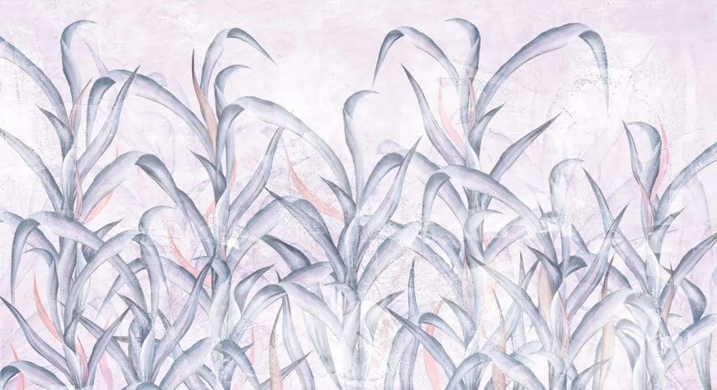 Zobrazuje houštinu listů – snad kukuřice, snad nějaké exotické rostliny – v neobvyklém, nesmírně veselém barevném provedení. Převládají odstíny modré, které byly zkombinovány s jemnou pastelovou růžovou. Celé to vypadá opravdu stylově a elegantně. Barvy jsou teplé, nenápadné a budou dokonalým pozadím pro prvky interiérového designu v jiných barvách.