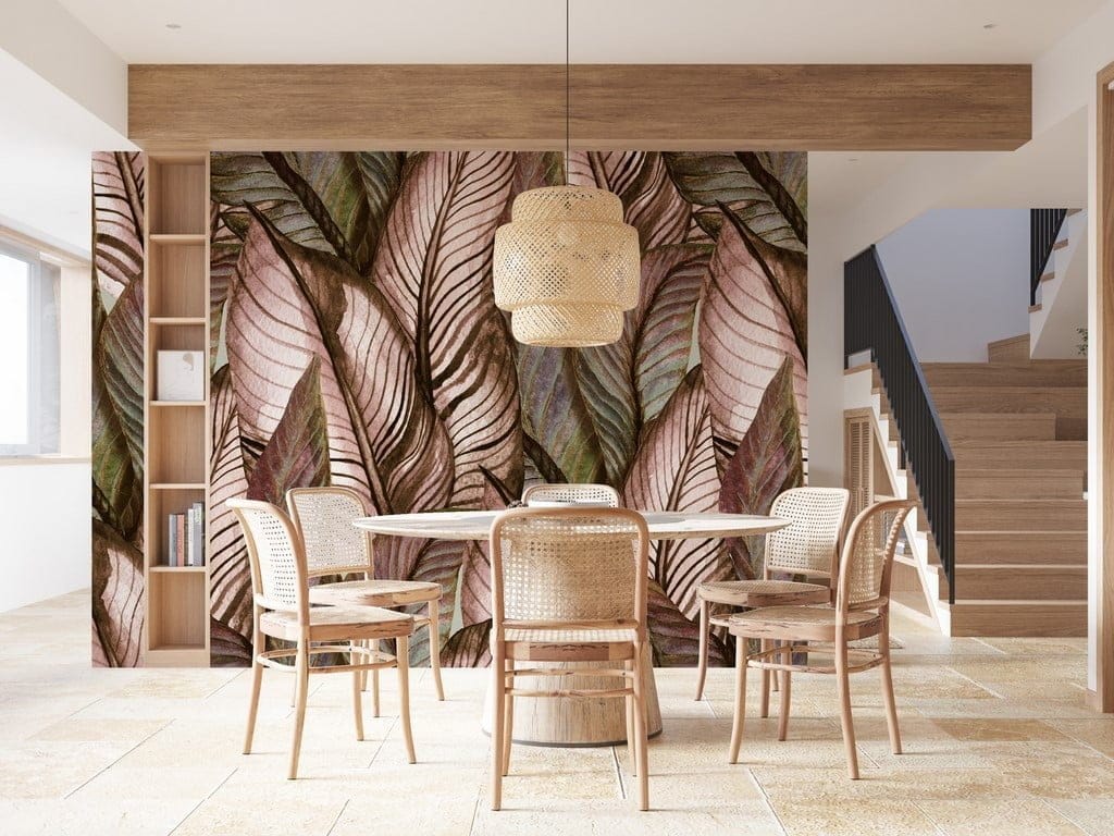 Elegantní fototapeta s květinovým motivem je tou nejlepší volbou, jak zkrášlit a dodat místnosti výraznost a eleganci. Vzor, pro který byly listy použity, je univerzální a módní. Hnědá přecházející do tlumené zelené jsou mimořádně vkusné barvy, které jsou dostatečně neutrální, aby se snadno začlenily do interiéru místnosti. Na nástěnné malbě převládají tmavé tóny, které jsou však vhodně vyváženy světlými. Díky tomu celek není ohromující, ale prezentuje se lehce.