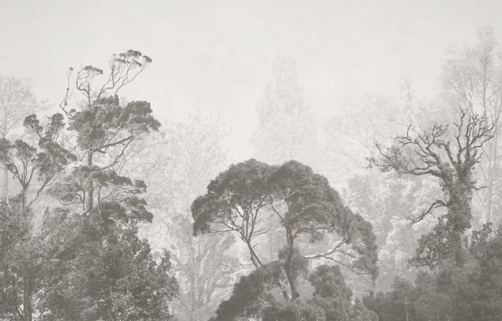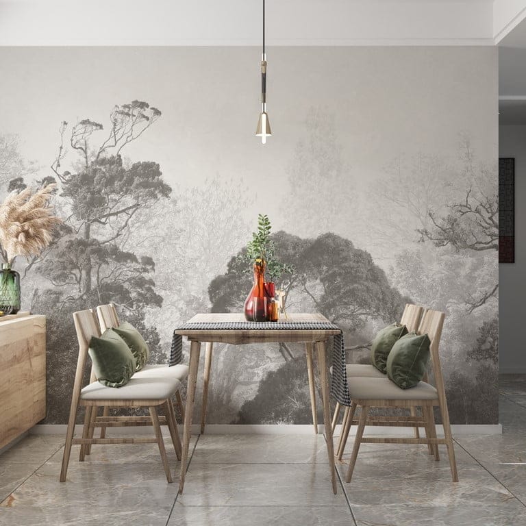 Nástěnná malba v syrovém, chladném stylu. Zobrazuje exotické stromy zahalené v tajemné mlze. Černé stromy jasně vystupují na výrazně světlejším pozadí, takže jsou dobře viditelné.