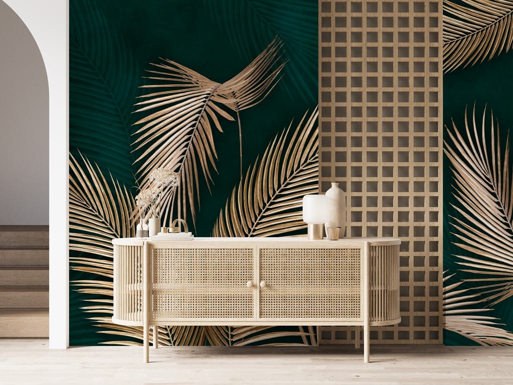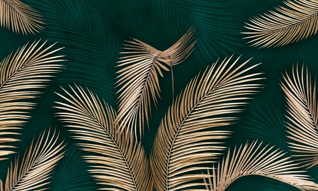 Zobrazuje zlaté listy palem, které byly umístěny na pozadí v lahvově zelené barvě.