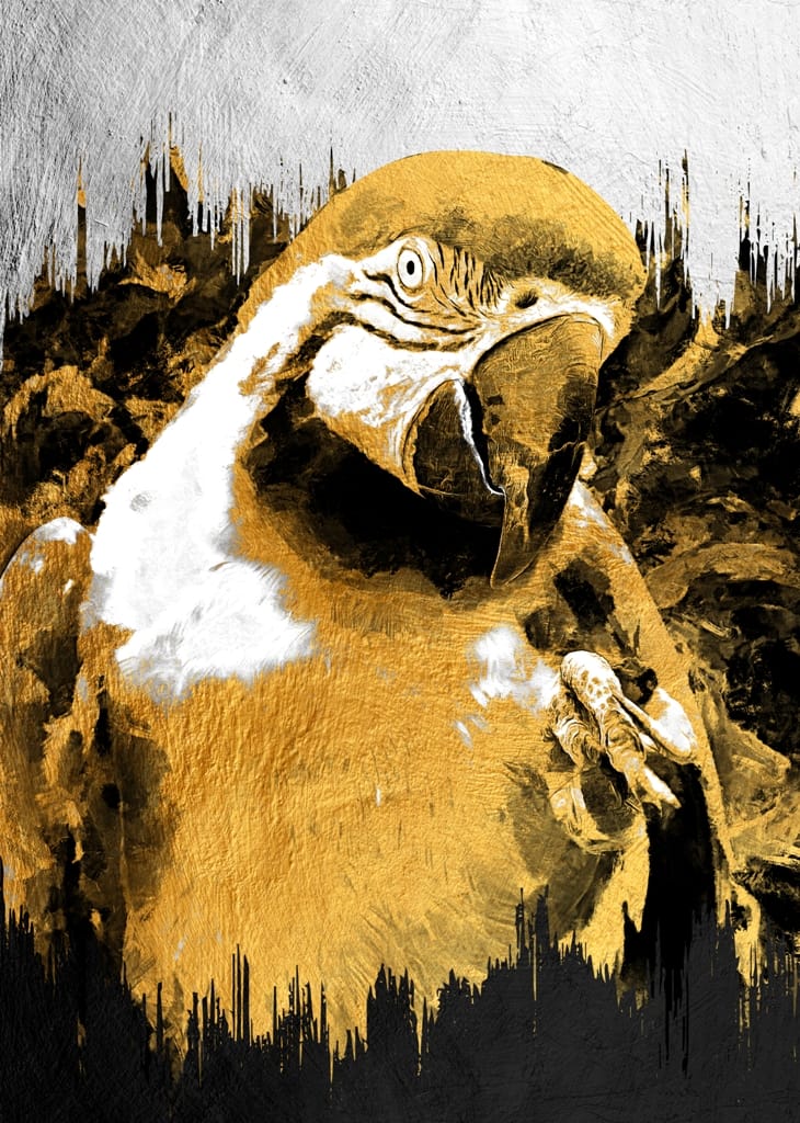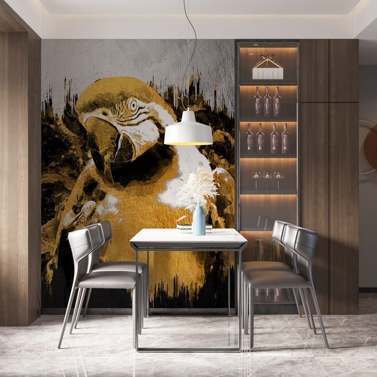 Pozadí, na kterém je papoušek umístěn, je zčásti šedé a zčásti černé. Vzniká tak výrazná a originální kombinace, která se bude skvěle vyjímat v každém moderním interiéru. Je dobrou volbou jak pro originální obývací pokoj, tak pro pokoj odvážného teenagera.