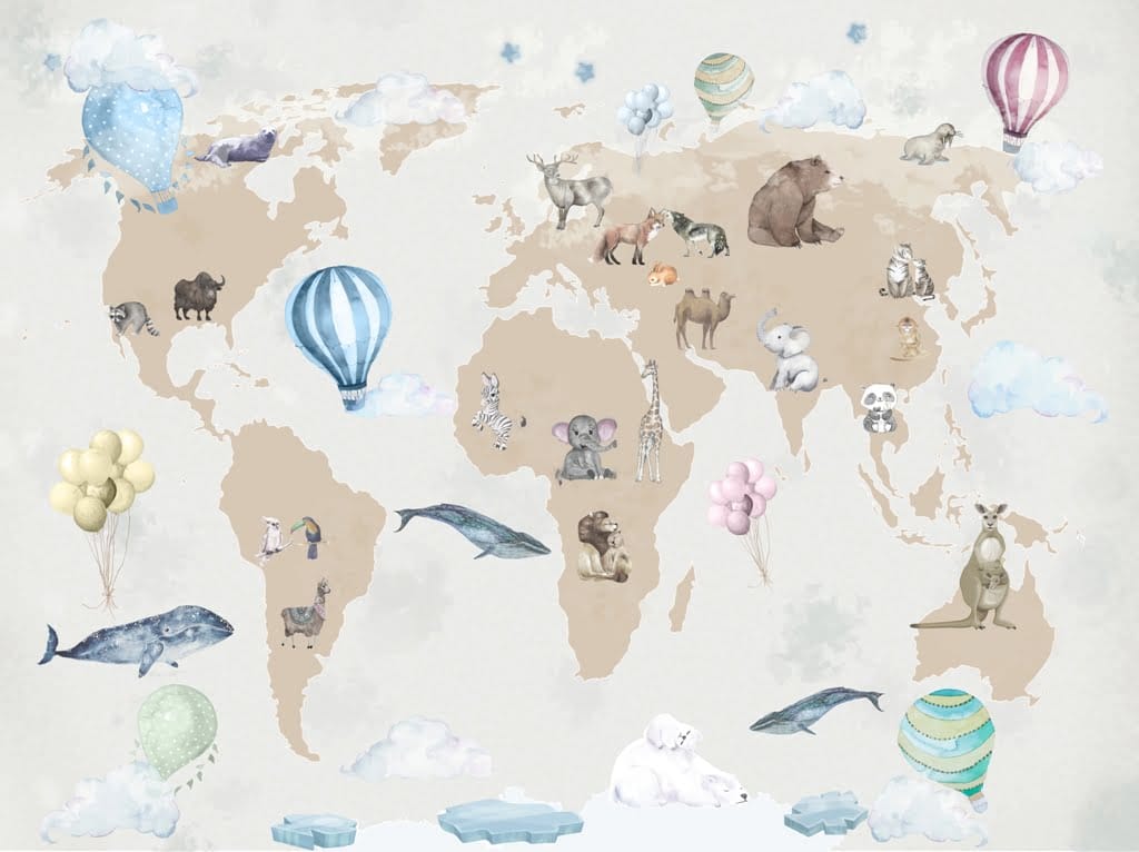 Jemná nástěnná malba mapy světa v neutrálním estetickém stylu je dobrou volbou do pokoje pro dospívající i dospělé. Díky použití jemných pastelových barev není celek křiklavý, ale umožňuje decentní výzdobu místnosti. Použité barvy navíc ladí s většinou interiérových dekorací. Na nástěnné malbě jsou vyobrazena zvířata, díky nimž mohou pozorovatelé získat informace o místech, kde žijí. Nástěnná malba tak má spíše vzdělávací než jen estetické kvality.