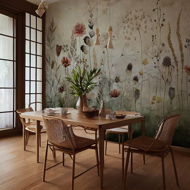 • jemné rostlinné vzory – listy, trávy a květiny v tlumených barvách vytvářejí přátelskou atmosféru